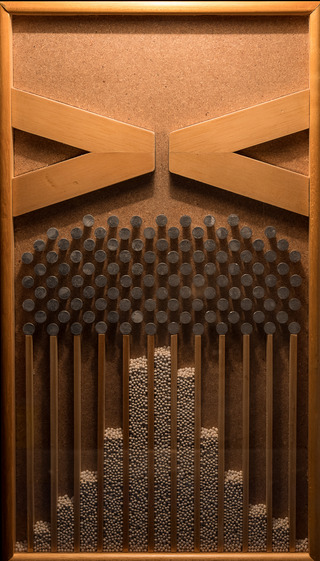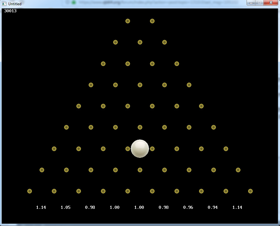 The final version will feature proper ball movement mechanics, acceleration under a constant force (gravity), friction and bouncing off the pins.  This preliminary demo just does the random left-right probabilities.  You will need to let the program run a number of goes to accumulate exit statistics.