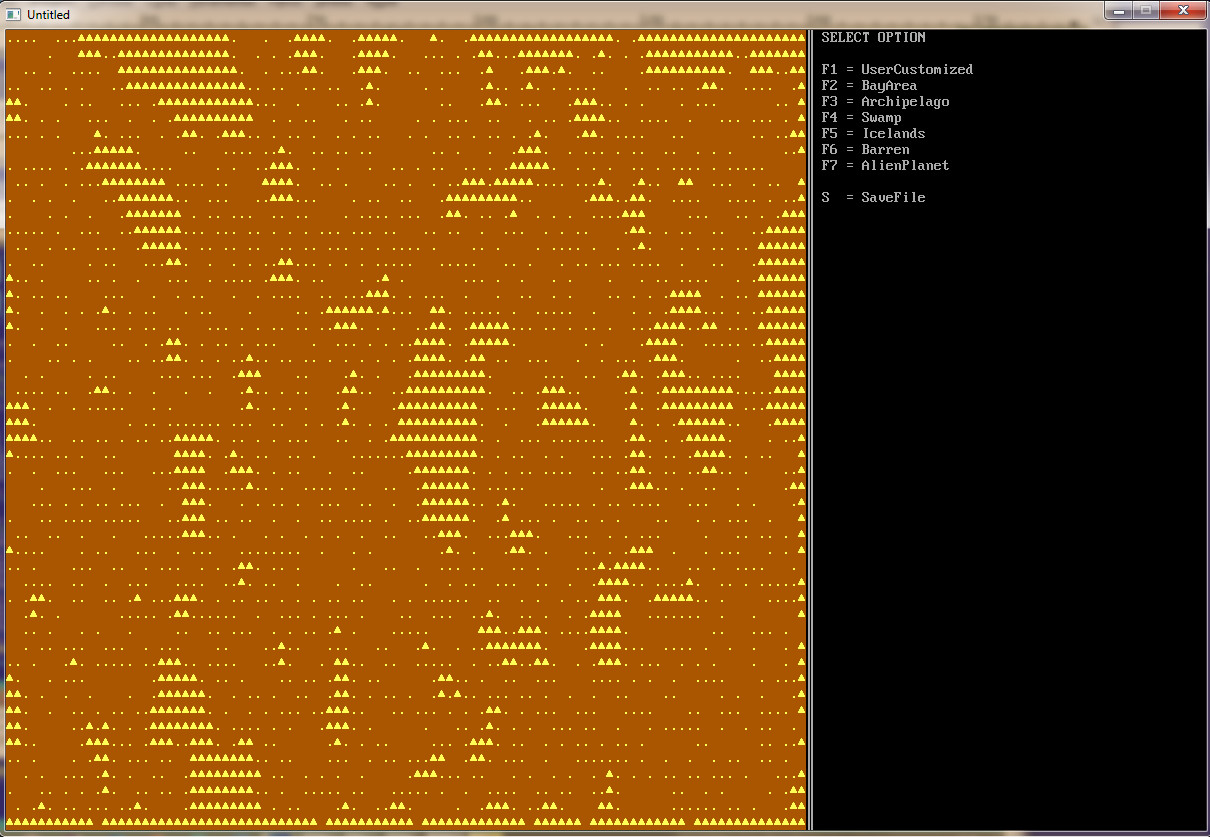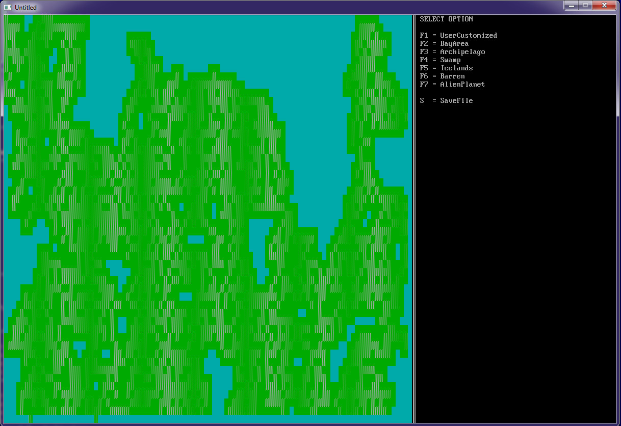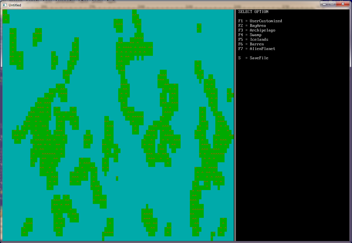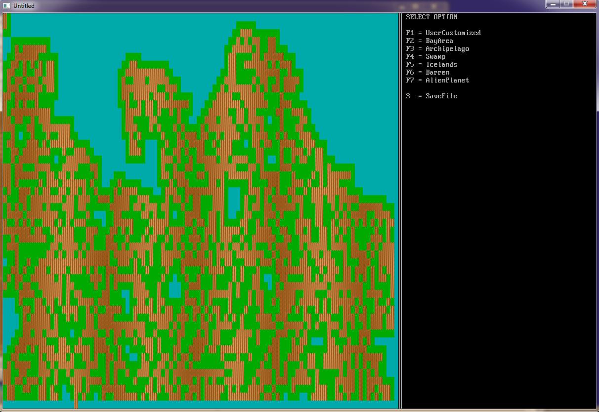 35.     ProceduralGeneration CharX, CharY, MoundAscii$, MoundFColor, MoundBColor, PlainAscii$, PlainFColor, PlainBColor, WaterAscii$, WaterFColor, WaterBColor, MoundChance, MoundBoldness, WaterLevel