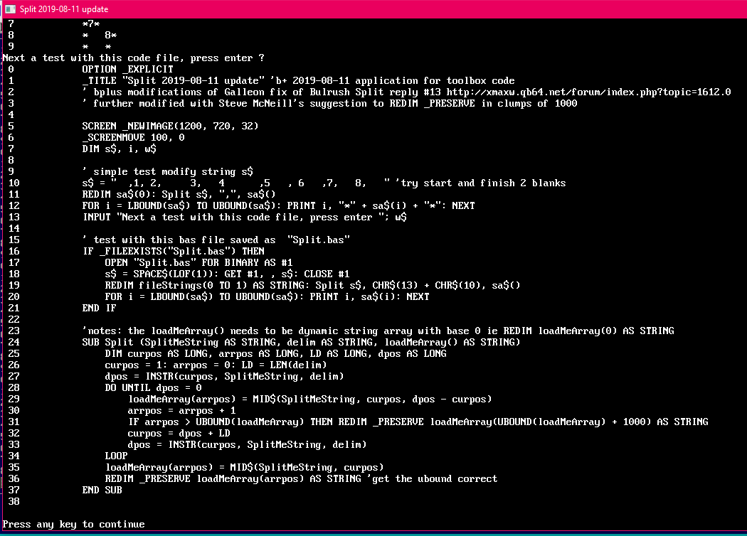 33. SUB Split (SplitMeString AS STRING, delim AS STRING, loadMeArray() AS STRING)