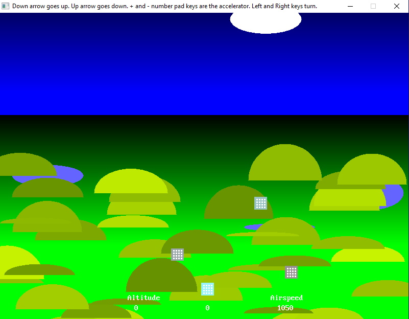 21.     IF a$ = CHR$(0) + CHR$(72) THEN d = 6: e = e + .5: b = 0 'Up arrow key flies down.