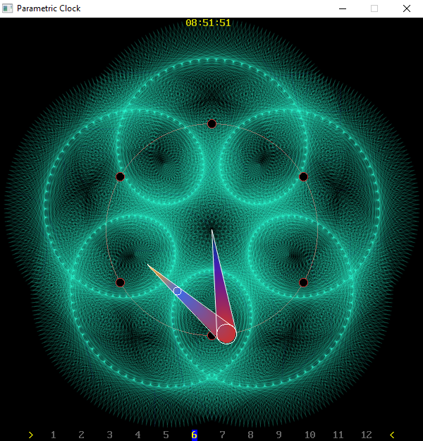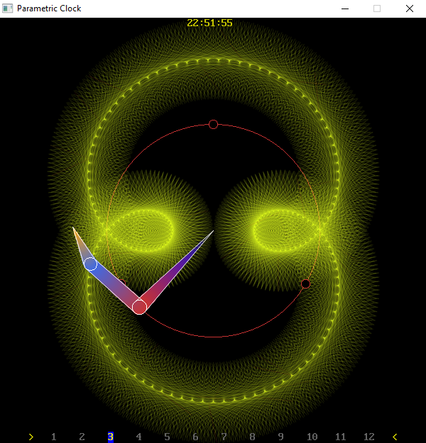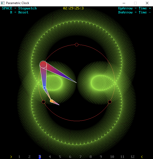 Pay close attention to the background, or so-called clock face. I discussed heavily (on a nearby earth rotations thread) why the looping structure only has 11-fold symmetry on a 12-hour clock face, which I hope is clear by now. The way I generate the clock face is like this: Before the main loop, start with a black background and run the clock through an entire cycle, only plotting the "second" hand. Keep that image as the background, you can see plenty of "nodes" where the second hand overlaps itself at different times. Needless to say, the minute hand traces along the nodes.