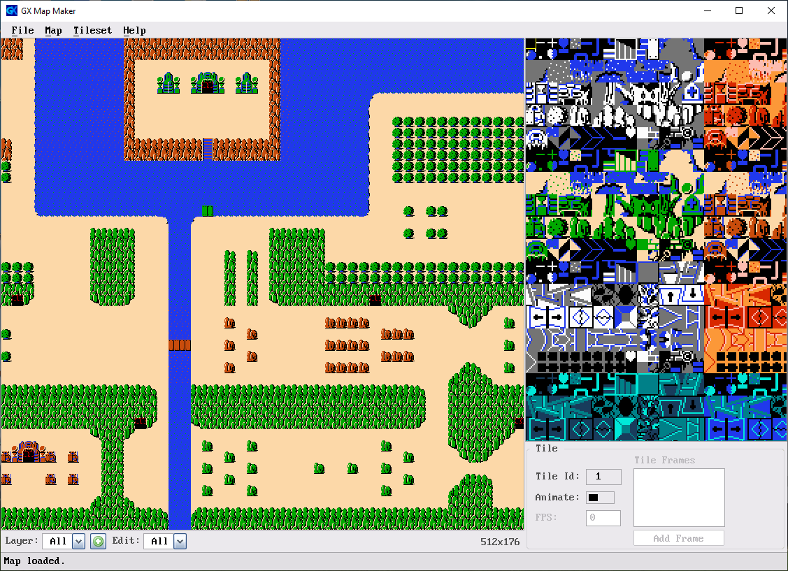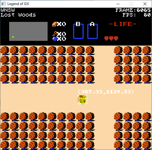 Since there are a number of zelda projects currently in-progress, I thought I'd put together a little version as a shameless plug for GX.  One of my current game projects is actually a NES mashup that will have crossover from a number of titles.  So I already had the map built using the GX map editor.  This version will let you walk the entire overworld map.  As an example I've also implemented the lost woods maze.  There are triggers on the map for all of the cave and dungeon entrances.  At the moment this will take you to an empty cave map.  (I haven't built any dungeon maps.)  If you exit the cave it reloads the overworld map and puts you back in the right spot.