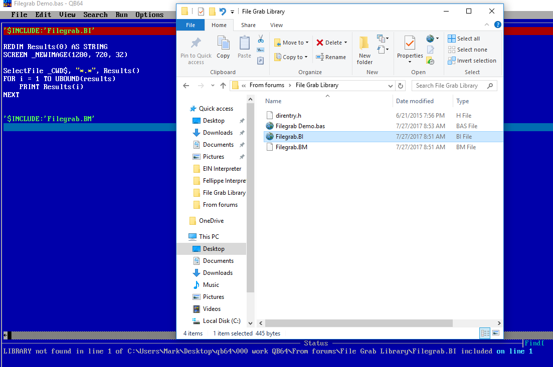 Yep! I copied everything to QB64.exe folder and the demo .bas runs fine from there AND it now runs fine from the grabfile Folder as well.