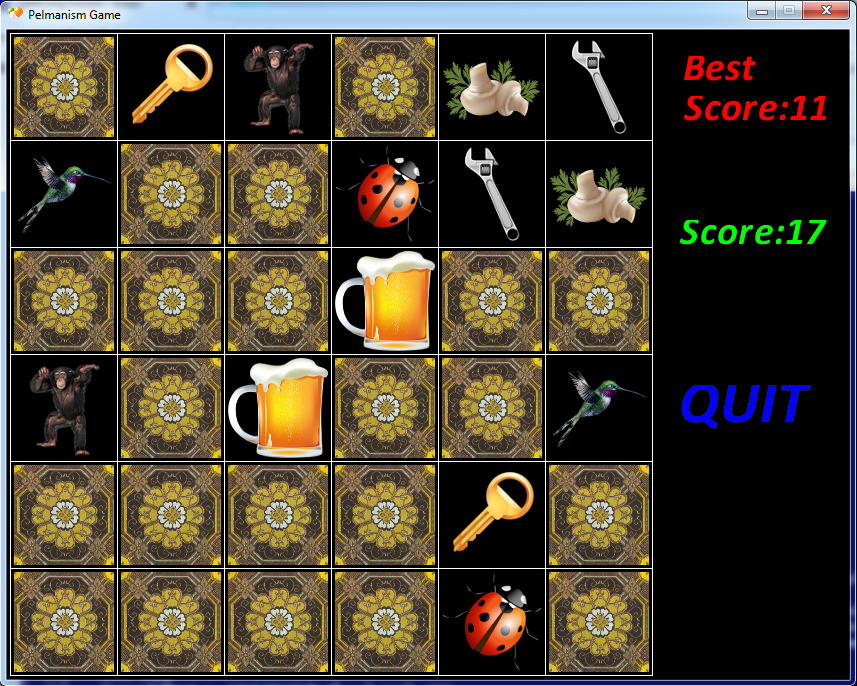 This is a game of Pelmanism ("Pairs"), where you have to use your memory to match pairs in the shortest possible number of attempts.  The program has been updated (and upgraded) from the previous version which appeared on the .net site.  I now realise that that previous version contained portions of rather ghastly coding which I hope has now been improved.  Younger family members may find this program of more interest.