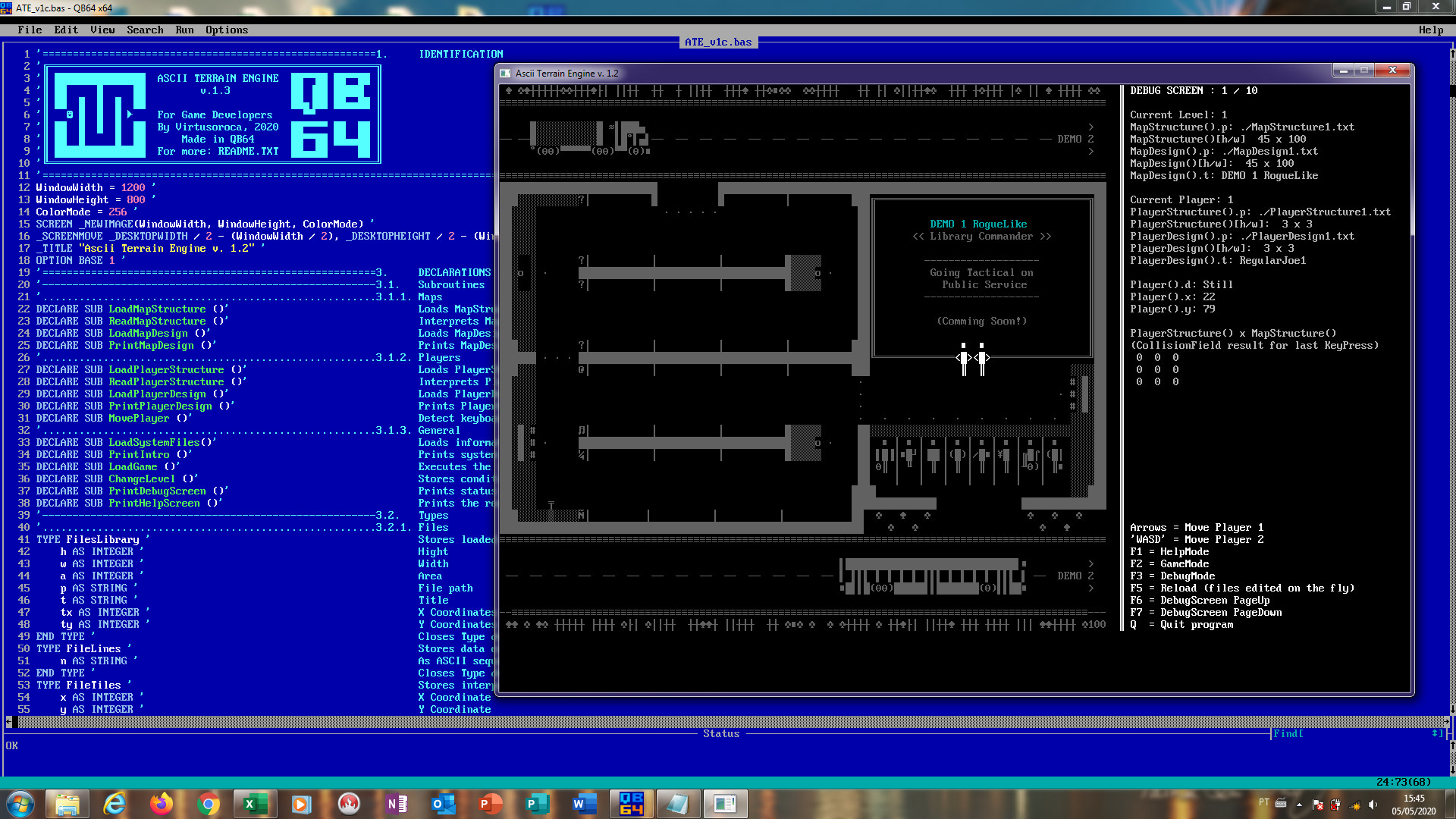 Hello everyone. Just arrived. Excited with QB64 and the forum. Finished my first program since the mid '90s! Its a very limited game engine focused on ASCII characters, where you can load customized maps and players from txt files, with collision detection (Players x Maps), and DebugMode. My time is running out so I skiped some demo scenes I planned and decided to share what I have. Looking forward to some harsh comments, particulary regarding collision detection. Start: unpack everything in QB root and hit run. For more: take a look at README.TXT.