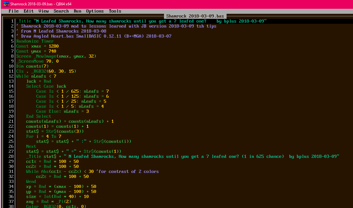 1. _Title "N Leafed Shamrocks, How many shamrocks until you get a 7 leafed one?    by bplus 2018-03-09"
