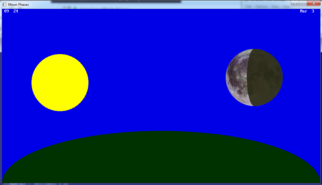 This is a simple little program demonstrating how the phases of the Moon develop depending upon the positions of the Moon and the Sun in the sky.
