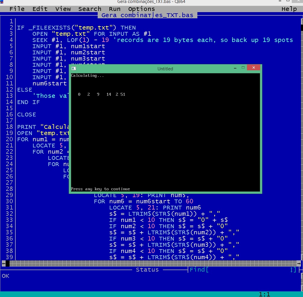 59.                         IF INKEY$ <> "" THEN PRINT: PRINT: PRINT "Terminated Program.  Calculation paused; run it again to resume list generation.": END