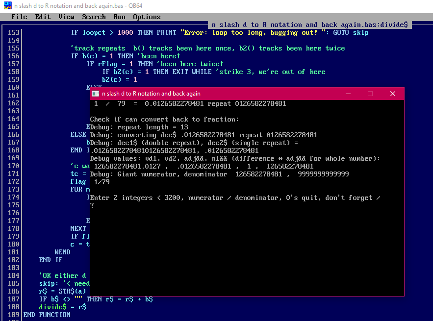 65.     PRINT "Debug: dec1$ (double repeat), dec2$ (single repeat) = "; dec1$; ", "; dec2$