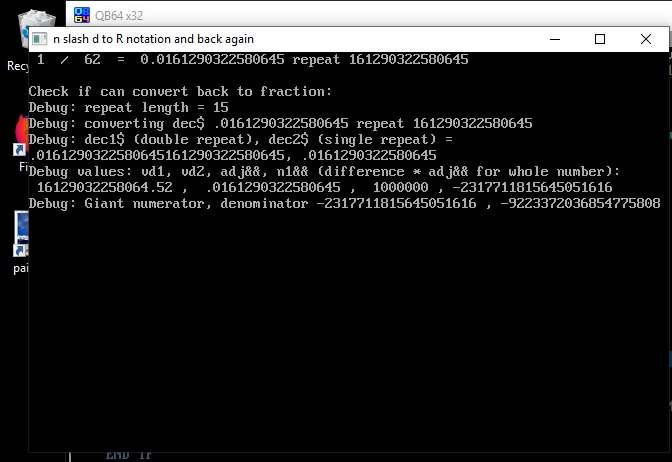 Oh! looks like I was allowing repeat sections up to 15 because 1/62 was 15. OK on my system QB64 v1.3 on Windows 10,   the code works and arrives back at 1/62.