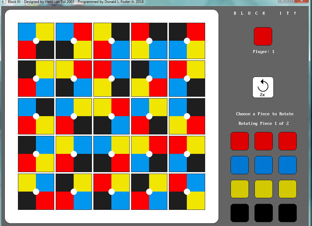 The game starts off with the 25 pieces randomly arranged on the board. Each piece has a white stem so the pieces can be picked up and rotated. The pieces have 4 colors in each corner of the piece representing each players color. The players are trying to arrange 4 blocks in a square shape pattern trying to match the 4 inner corners colors to their color. Once all 4 corners match the player's color, that player places 1 of their blocks in the center of the 4 pieces claiming that spot on the board. Those 4 pieces a now locked down to the board and can not be rotated. If at the start of a players turn, there is already a new matching pattern with their color, the player place 1 of their blocks in that space, then the player takes their turn. If a the end of their turn, a new pattern of their color is formed, they place 1 of their blocks in the pattern.