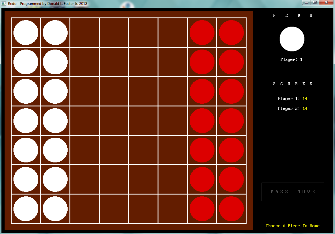 Redo is a 2 player board game played on a 7x8 board with 28 double sided pieces. Each player has 14 pieces lined up in the last 2 columns on their side of the board. Player 1 plays the white side pieces and player 2 plays the red. Piece are similar to those in Othello with the same goal, to have the most pieces flipped to their color at the end of the game. The game is tracked by points. The game ends in 1 of 2 ways, if neither player can make any move or if both players skip their turn consecutively.