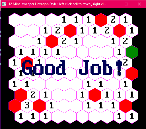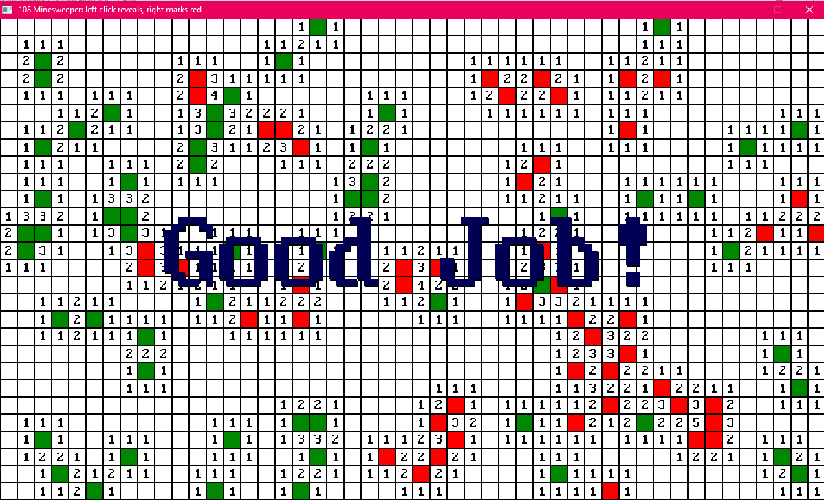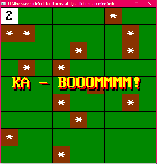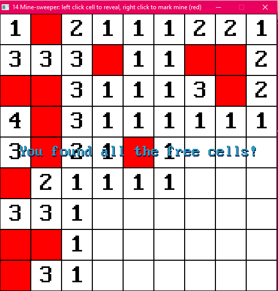 ) + " Minesweeper: left click cell to reveal, right click to mark mine (red)" reveal