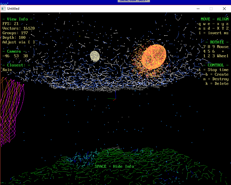 As a mere coincidence, I was working on streamlining the 3D world explorer from a few months ago when the starfield subject came up. For those not familiar with this work, below is a full-fledged 3D vector engine that, due to a cool breakthrough involving linked lists, has the flexibility to backbone any 3D engine. For now it stays (almost) strictly in the QB45 domain - no textures, GL commands, libraries - basically no cheating whatsoever. The math is done (as you may have guessed) with vectors, and avoids trig completely. (The 3D calculations involve zero trig, but some objects in the world are best made using trig functions and these are completely nonessential.)