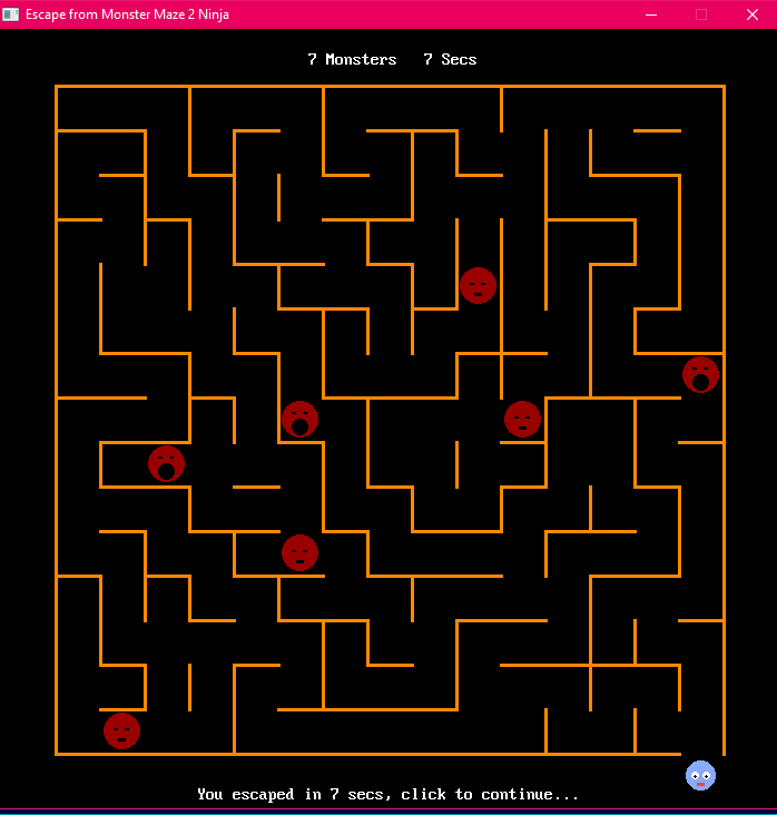 I am releasing #3 first because the Ninja version doesn't have the latest in Monster code changes and other refinements. This works pretty well I think, maybe even easier that EasyLang version because more walls are removed when monsters are added. Really it starts to become a game of Dodge ball when you get up to around 10 monsters. :)
