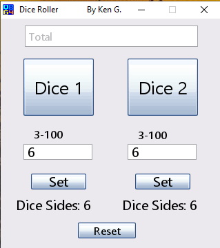 OK, took me a couple hours but I did it! I let the user enter any amount from 3 to 100, which is just about any dice I believe, on both dice. If you enter more it brings it down to 100 and less it brings it up to 3. It starts out as 6 for both of them as well as when you click Reset. I learned a lot about strings and variables using textbox and also using numeraltextbox which is only for numbers. I kept the Total as a text box though because I like how it states "Total" before you do anything inside the box. This can be used for any game that uses dice. If you are missing dice, just use this instead. This is the best program I've ever made that uses Windows Forms. :) I'm learning!
