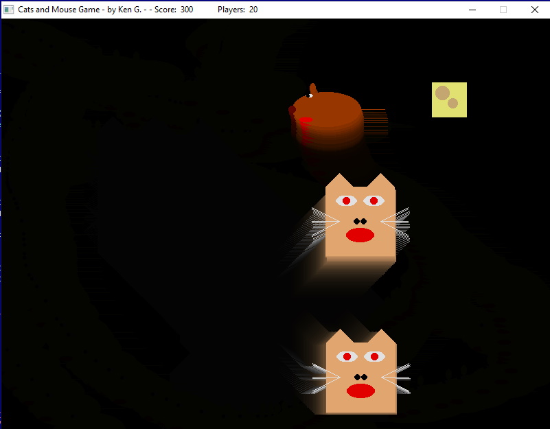 Using the code from my other thread called Mouse Trail, I was able to make this game within a few hours today. Half-way through it I remembered that B+ made a very similar game just like this months ago so I decided to just make my own version. I'll post a picture of the game below too. You control the mouse with your mouse away from the 2 big cats to try to eat the cheese. The speed of the cats increases at a gradual rate as the game goes on. I use an equation to make the speed also go higher if your mouse dies so it won't start over from the slowest speed again. Instead it uses the score you had for the speed for the next mouse. When you start out, the cats are off the screen so it takes a few seconds to see you and chase you.  All of the text is in the title bar. When all your players are used up, press Enter to start again, which it says in the title bar. Unless you are super good, the game only lasts a couple minutes or so, feel free to change anything in the code to suite your needs. I tried my hardest to make the mouse and cats look good. :)