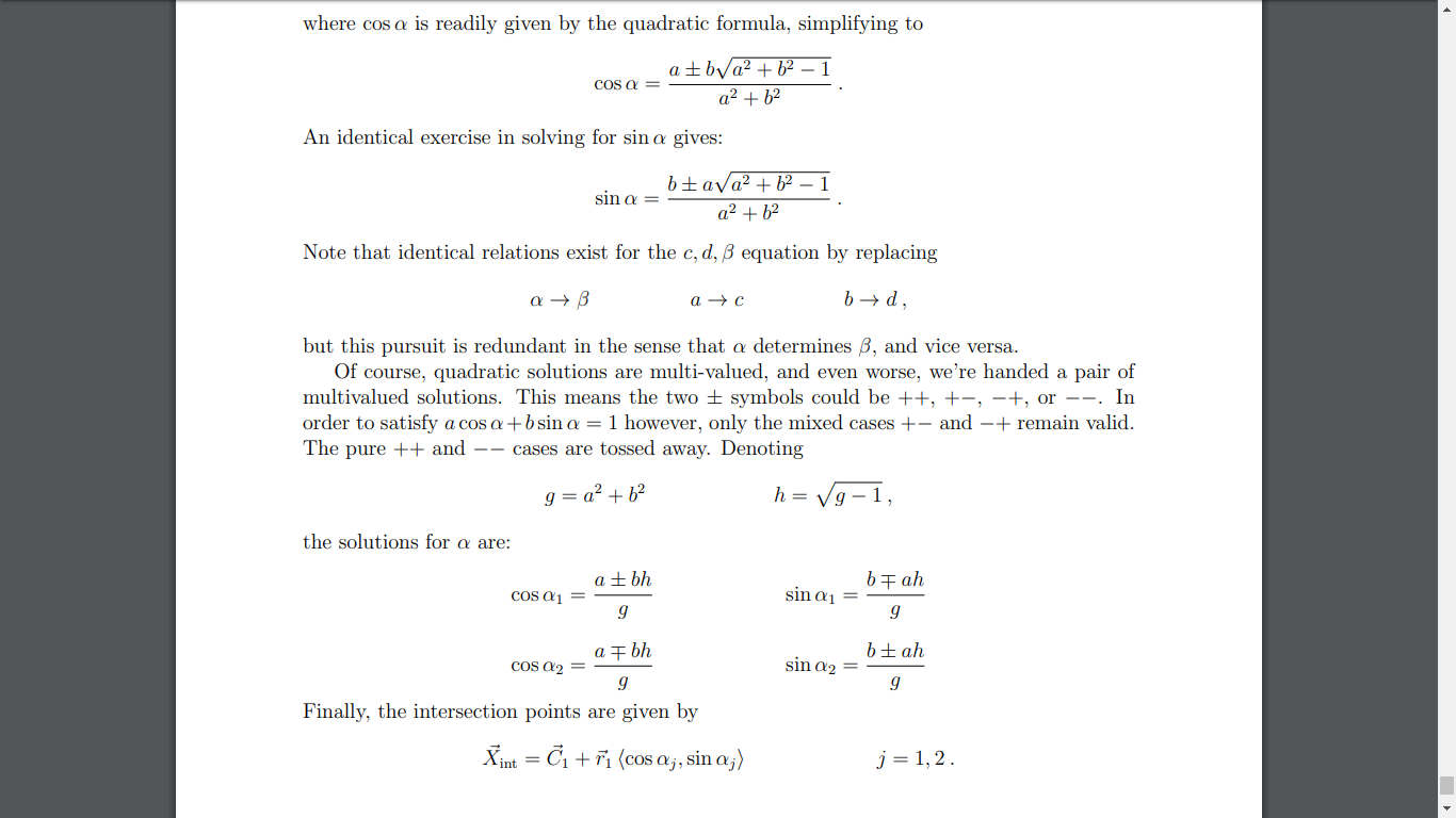 Any method that can be reduced or duplicated by printing the two circles on two pages and holding the pages up to the light to look for intersections is... cute, but I hope we don't need to explain the fallibility of these methods. At this point I have a choice: (i) either spruce up the sample code so it works nicely in all quadrants, or (ii) write up the derivation so then anyone can do it properly. Choices choices... where's my bong?