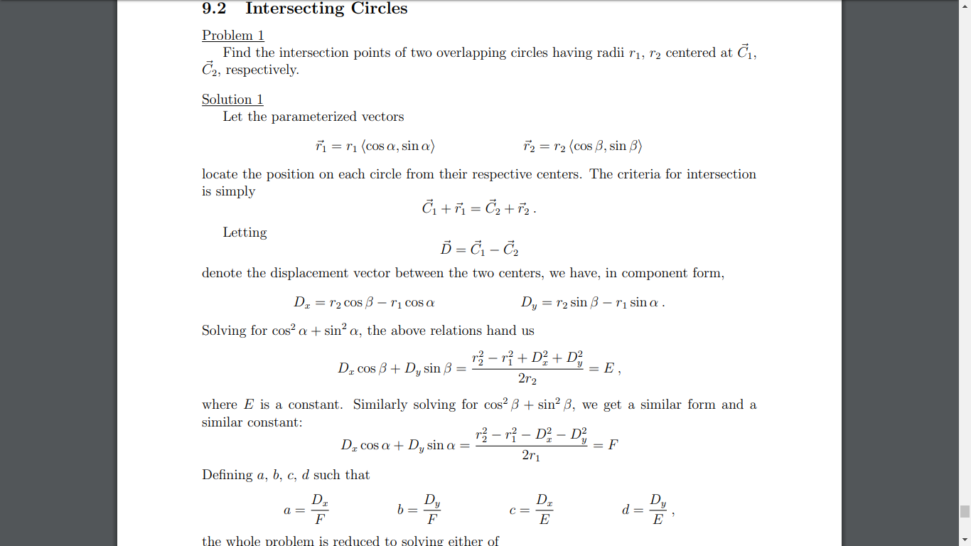 Any method that can be reduced or duplicated by printing the two circles on two pages and holding the pages up to the light to look for intersections is... cute, but I hope we don't need to explain the fallibility of these methods. At this point I have a choice: (i) either spruce up the sample code so it works nicely in all quadrants, or (ii) write up the derivation so then anyone can do it properly. Choices choices... where's my bong?