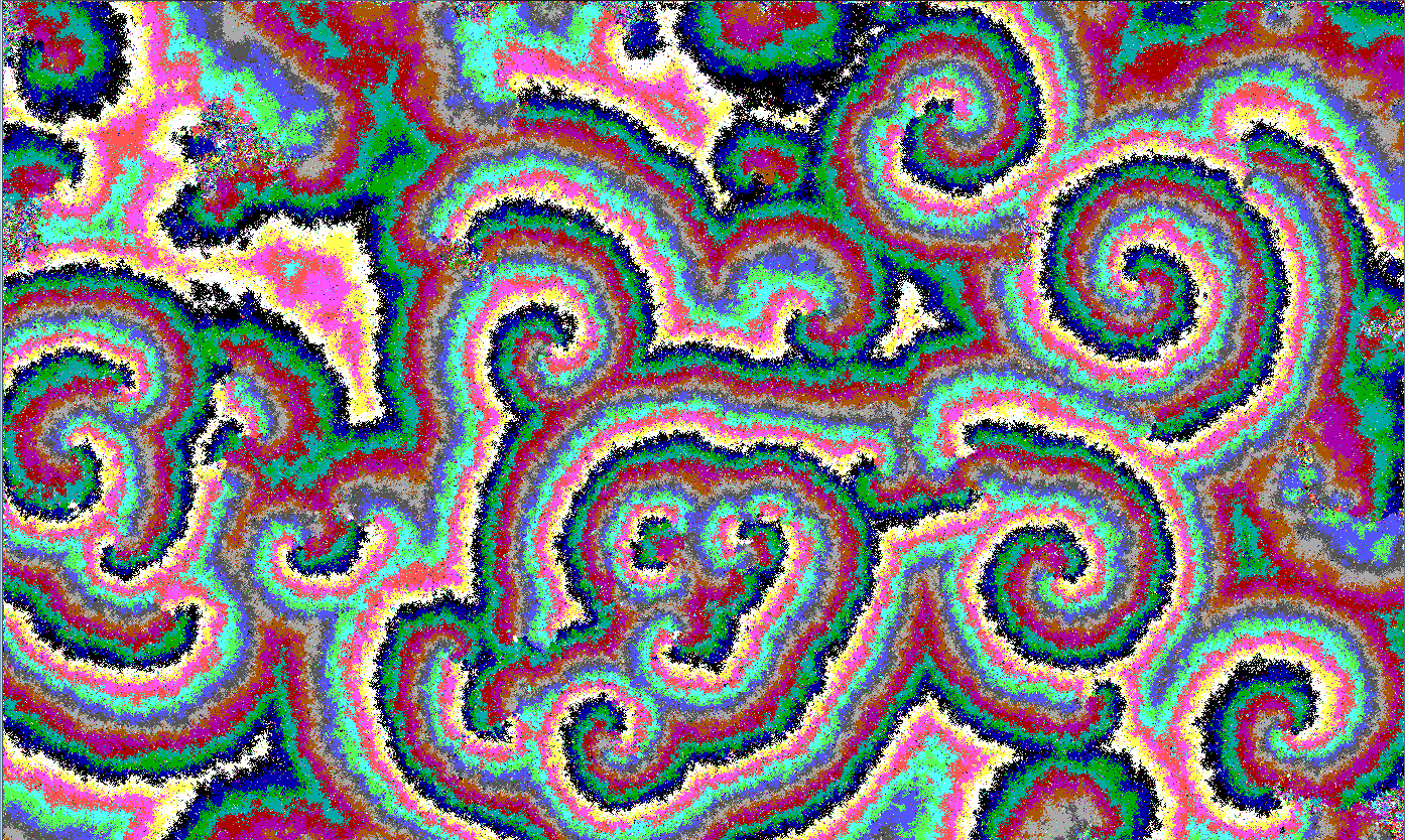 Mike, I tried your first program.  Quite amazing and lovely.  After about 8 minutes on my Core i5 machine I got a structured pattern of spirals (somewhat dependent upon screenw & screenh), with the spiral patterns actually spiralling.  But I note that you do not have a RANDOMIZE(TIMER) anywhere in the code.  Elsewhere on this forum, the experts have discussed how random is the function RND.  So I inserted RANDOMIZE(TIMER) to happen periodically in the loop.  I found (twice) that without RANDOMIZE(TIMER) I got spirals, but with RANDOMIZE(TIMER) I did not get spirals (although they may have taken rather longer to form).