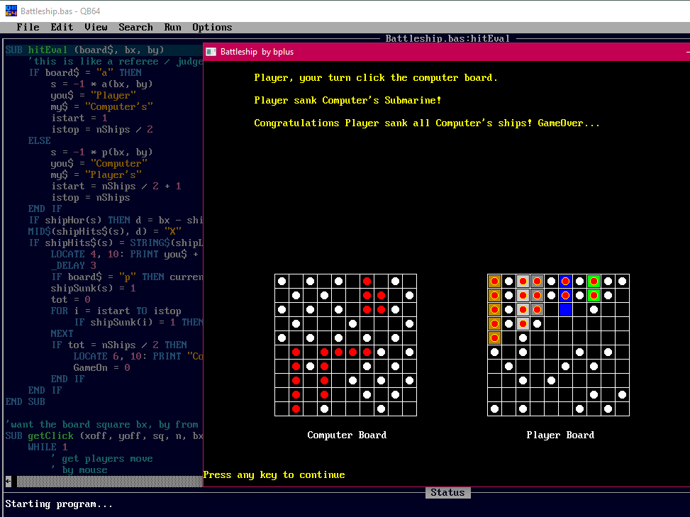 There is a sort of referee HitEval sub that "announces when a ship is sunk" to each party and it is the part of the code that is tracking the hits on the ships.
