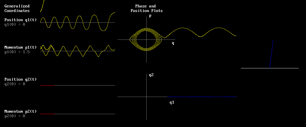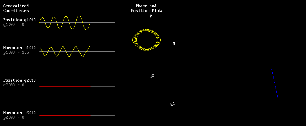 All that said, this post is NOT even about the final product. For now, I want to make people familiar with the graphs and notation I'm using. When you run the code below, and see the screenshots, you will see a handful of graphs. Now don't just tuck your head into your turtleneck - these are easy. On the right, you see a pendulum swinging in gravity - that's the *real* system we're simulating. On the left I track (as q1) the angle from vertical displacement of the pendulum, and also I track the angular velocity (as p1). There are other graphs that will be super obvious when you watch. Just like regular displacement and regular velocity, q1 and p1 determine the motion. Together these are, as you may have guessed, sinusoidal (swingy). Look at the sine-looking graphs on the left. All easy.
