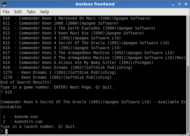 I wrote a simple command line frontend for DOSBox. It is able to list, search and launch DOSBox applications real fast with minimal setup. Hopefully useful for those with a large library of dos apps who cannot be bothered putting in the effort with a more complex frontend, managing multiple conf files manually or typing the dos commands everytime they wish to open an app.
