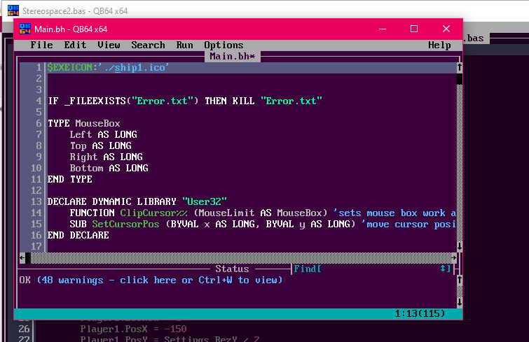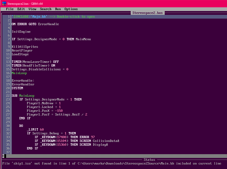 I figured as much, i am sorry as well, I suck at clarity of language... or so the wife says. However that "_ICON" line seems like it is missing a value or something, I may have accidentally removed something while hot keying around QB64. just remove the icon lines, they really aren't important honestly.