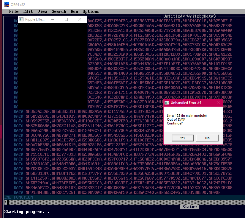 Never-the-less nice work getting rid of DATA, now this is worth a study. What is very interesting is that you still get an interference pattern when ripples run into each other! These are fake ripples and yet they appear to behave as real ones interference pattern and all! (I am speaking about the [abandoned, outdated and now likely malicious qb64 dot net website - don’t go there] version with mouse click x, y coordinated to picture).