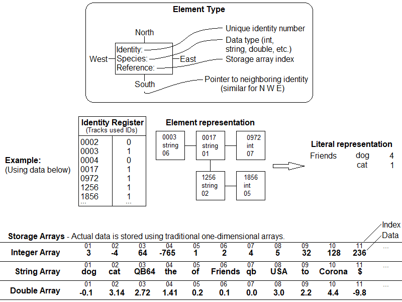 The meat and potatoes of the thing is in a UDT called an "element". Elements contain NOTHING but (i) a unique address for the element, (ii) a pointer to the index on the array holding a string, int, or double, (iii) a "species" variable saying which array to point to, and (iv) up to four more pointers to head over to different elements. Stare at the picture and look at the example drawn out - it will click.