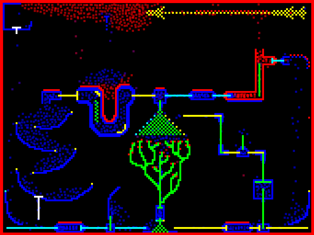 So those are the fundamentals... Then, with no real effort at all, we get new effects by mixing colors. So far I've only hardcoded yellow, which is a mixture of red and green. Averaging the effects of red and green, yellow lines are "hot capillaries". Right mouse button deletes level elements.