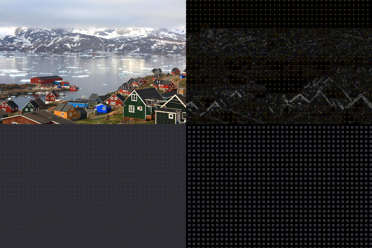 Out of interest, in this image I filtered out the lower frequencies rather than high frequencies and enhanced the otherwise very faint colors.  This highlights the information about the image lost in the above compression schemes.