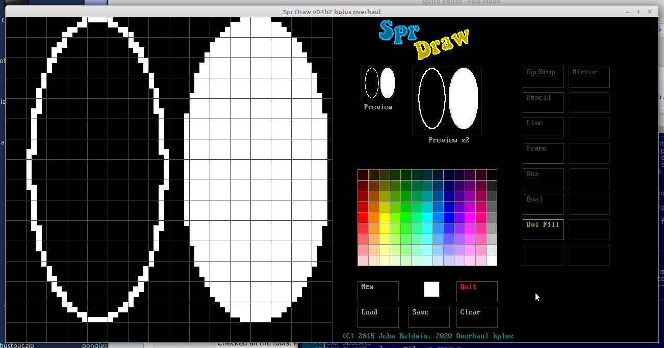 I think our next challenge: Sprite size. 8x8, 16x16 and 32x32... I only wished that I had not lost the early version that had various grid sizes.... The boxes and circles may not work so well on 8x8 and possibly the 16x16... The 8x8 is handy for "old school" games but I won't complain if we leave it out... lol  I'm going to go over my discs and archives to at least find a working prototype of grid changes. As you suggested before... there is no point re-inventing the wheel.... I will keep you posted.