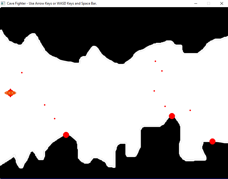 For almost a week I've been working hard on this game. I wanted to see if I could use the new scrolling map method that Felippe told us about recently and turn it into a spaceship game. In this game you control your tiny red ship with the arrow keys or WASD keys and press the space bar to fire. The object is to get to the end of each cave level. There's 3 cave levels included here that I made using my graphics program Paint.Net. I'm no artist but I tried my best :). One trick you will probably need to do is shoot your laser through the mountains to hit some of the shooting cannons. You don't destroy rocks but the laser goes straight through anything and you can shoot it in the 4 directions you can move with. I hope you all enjoy this game, it's one of the biggest games I've ever made. I realize that most likely the lines of code could be reduced dramatically (it has around 1000 lines) but I don't know how to reduce the number of variables yet like many of you guys do. The player.x, player.y, camera.x, camera.y variables I got directly from Felippe's original code. Which was a trick in itself to figure out what used 800 x 600 and what used the 4000 x 600 level picture files when adding more graphics to it with the game. I still don't understand it completely but I figured it out enough to use. Enjoy the game and please leave comments, thanks. All the files are in the zip file in attachments as well as a picture I will add. Oh also, I'm sure you all will laugh at the look of the ship, but like I said I'm no artist and I think it goes good with the laser sound. lol Oh one more thing, I added a lot of comments in the code on how it's very easy to add more levels. I used a separate program I made to detect coordinates with the mouse on the picture files so I could plot and display each cannon and their cannonballs.