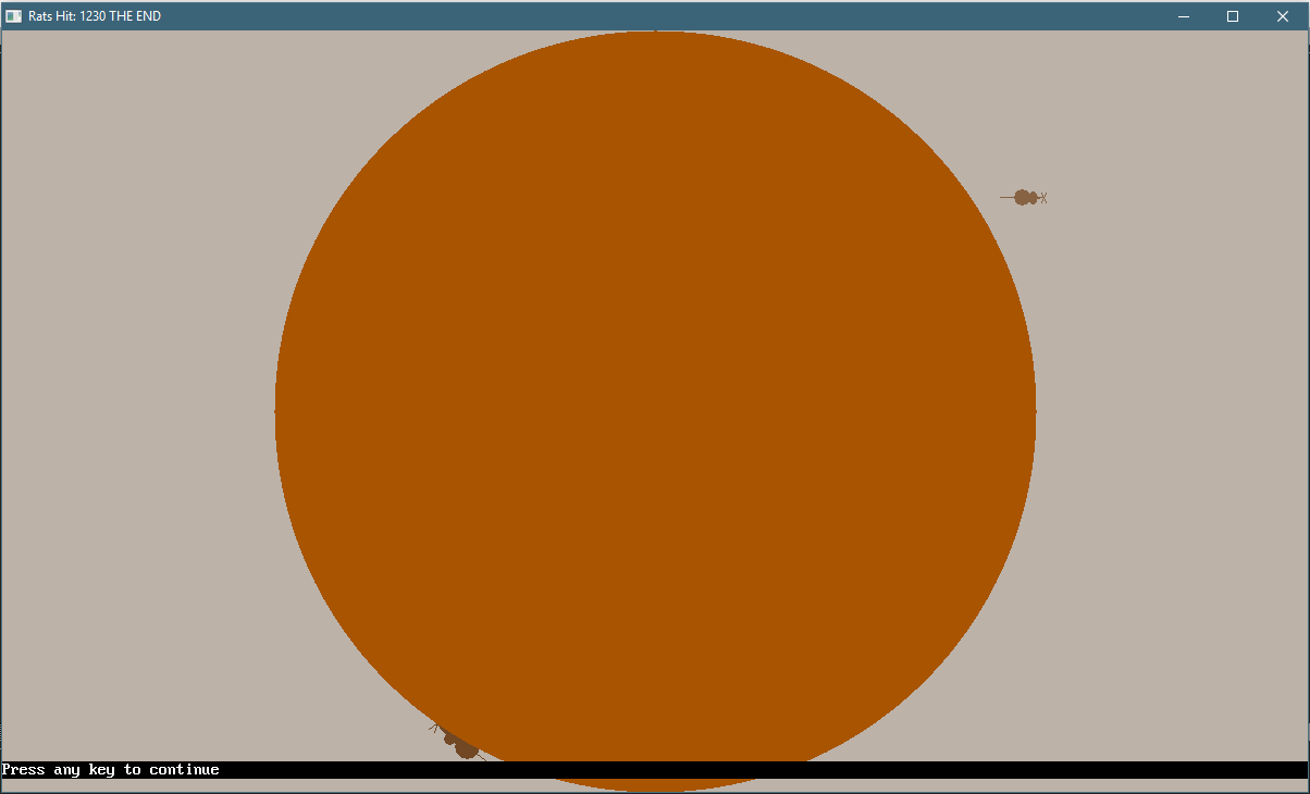 A slight improvement to would be to have the explosions happen as part of the main loop so there is not that slight pause every time you make a kill, that may just be my old laptop causing it though.  basically you have a explosion routine that is called each loop that makes the explosion grow a step. That way the explosions happen but the game doesn't pause, and it could even have multiple kills happening at once. kind of how my first (and only 100% completed) BASIC game , Space Dodger and the Giant Killer Space Hamsters, ran. a game lost to Geocities I'm afraid.