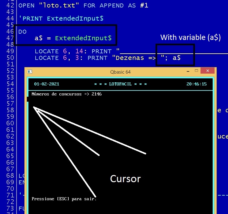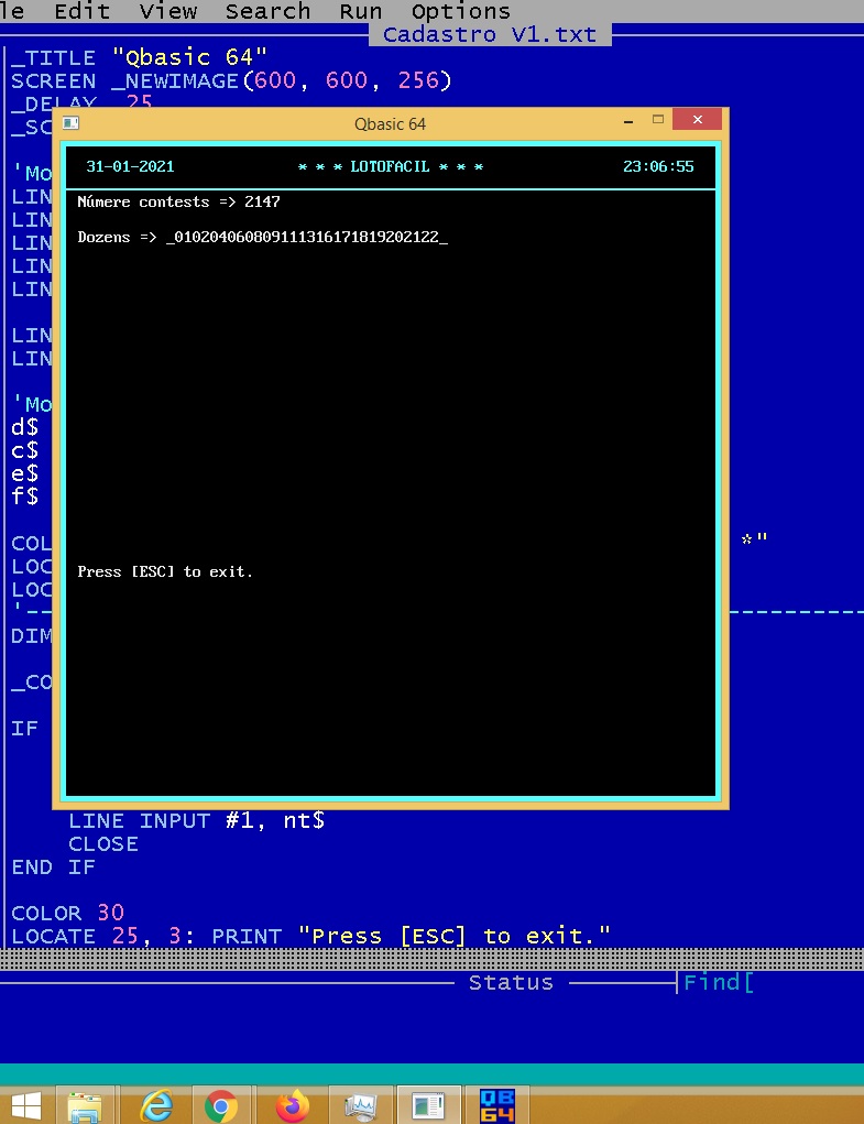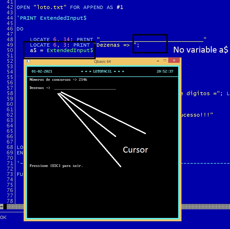 21. COLOR 11: LOCATE 2, 28: PRINT "* * * LOTOFACIL * * *"