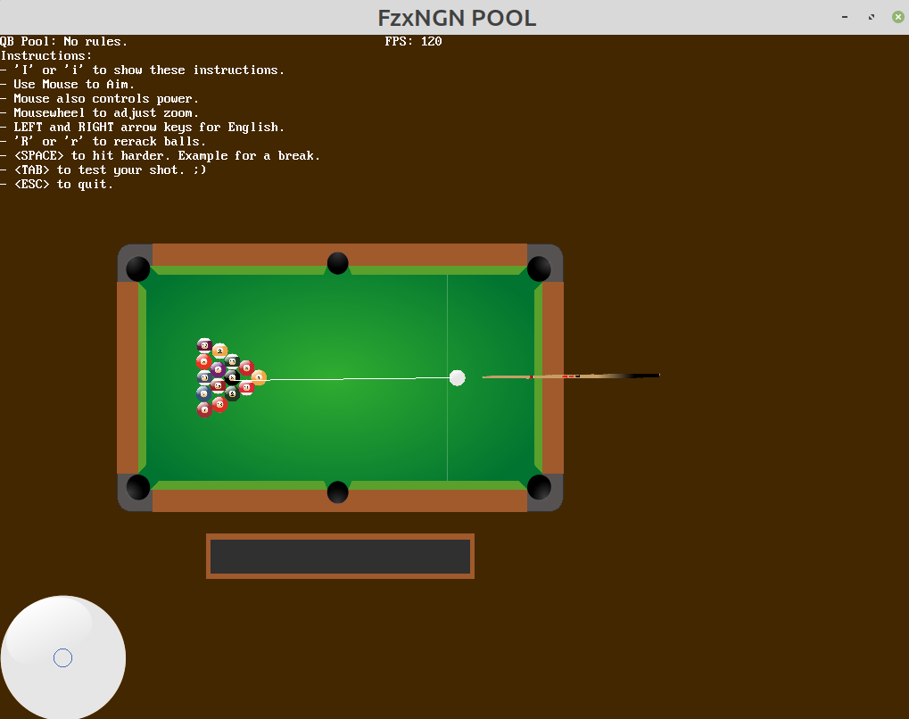 Since pool is inherently a 3D game, and my physics engine is 2D only. I do have not real good way to simulate full 'English' on the cue ball, so it only has left and right spin as of now. To help atone for that, I have provided the <TAB> key to help you predict your shots.