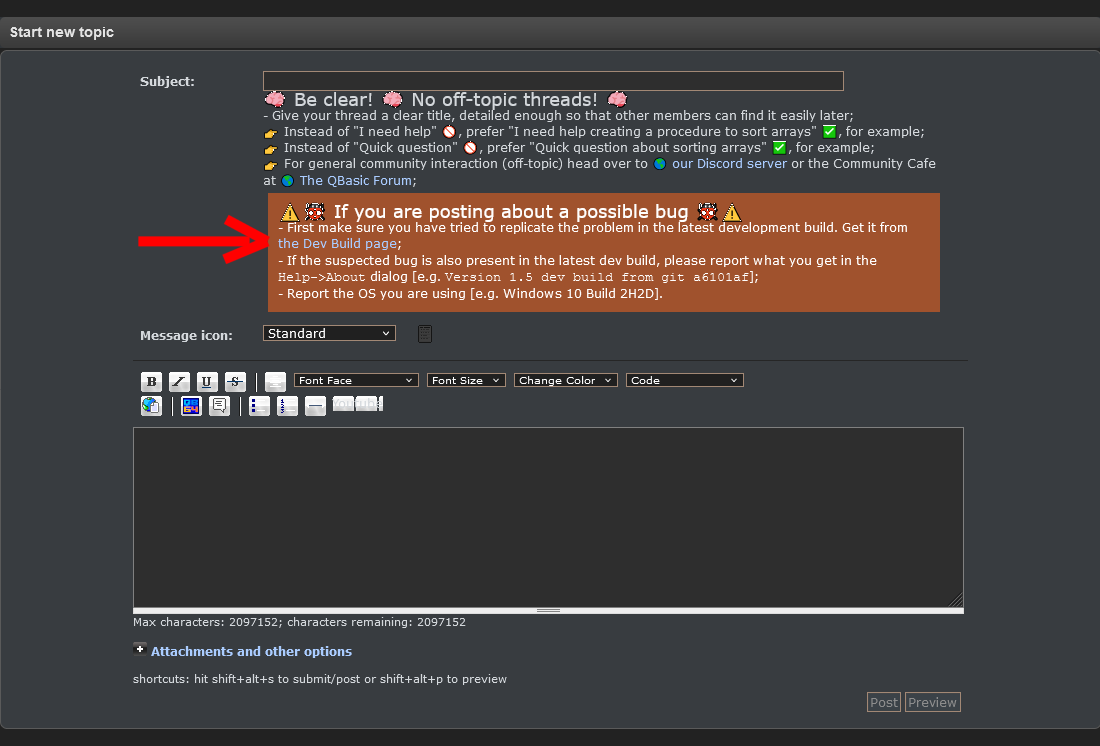 The broken kink is on the page when you start a new topic, in the "warning message" : "If you are posting about a possible bug".
