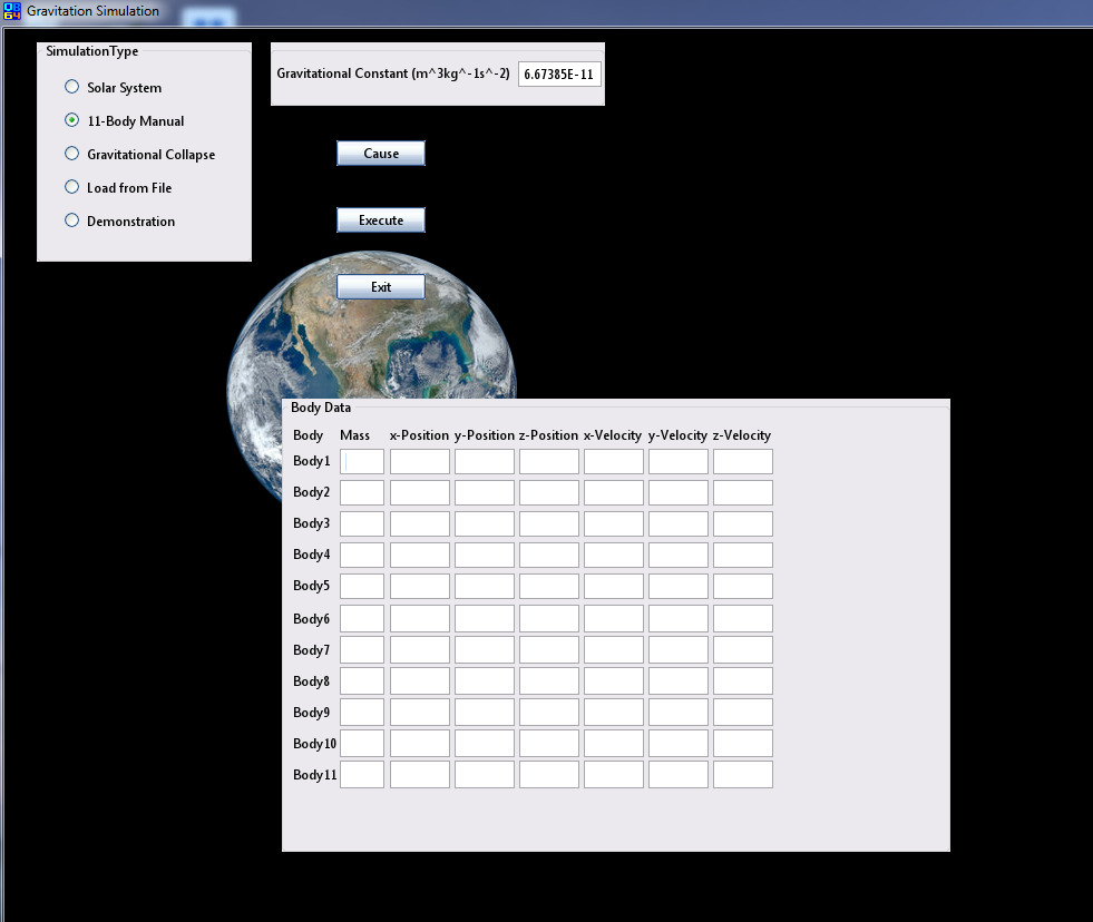 See attached image of part of the Gravitational Simulation program (NB Positions on screen are not yet set).  The program will allow the user to input the starting masses, positions (x-,y-,z-) and velocities (x-,y-,z-) of up to 11 bodies (why 11 bodies, not quite sure - that's what I have used in the previous non-Inform version of the program).  This means that there are 77 controls, individually labelled and each of which has to have code to check input and move on.  I've only started the coding of the first seven and the number of program lines is becoming substantial.