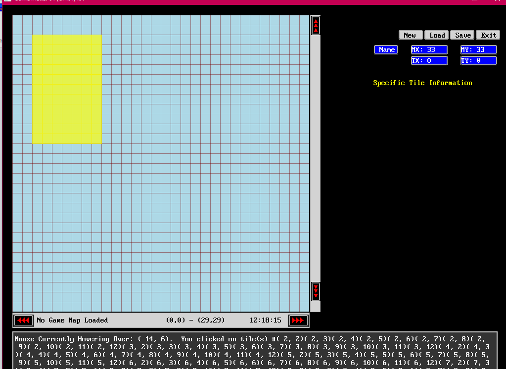 Once tile selection is finished, things should move along smoothly as I can then add buttons after that point to set the graphic to display on that tile, set walk/swim/move tiles, and other such things...