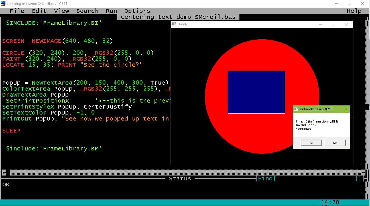 Using these files I got different error, while getting those from this link (HERE: http://qb64.freeforums.net/thread/46/text-frames ) they run fine.